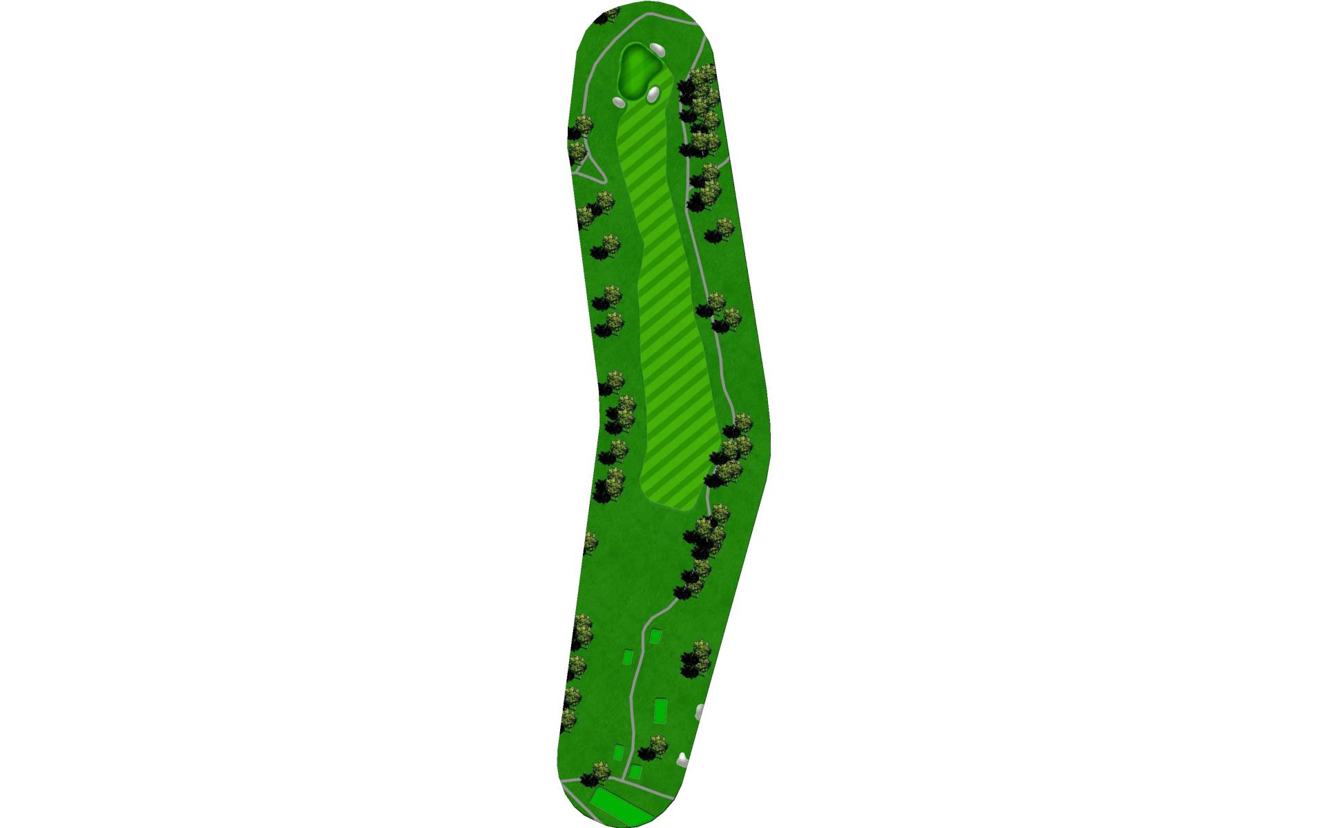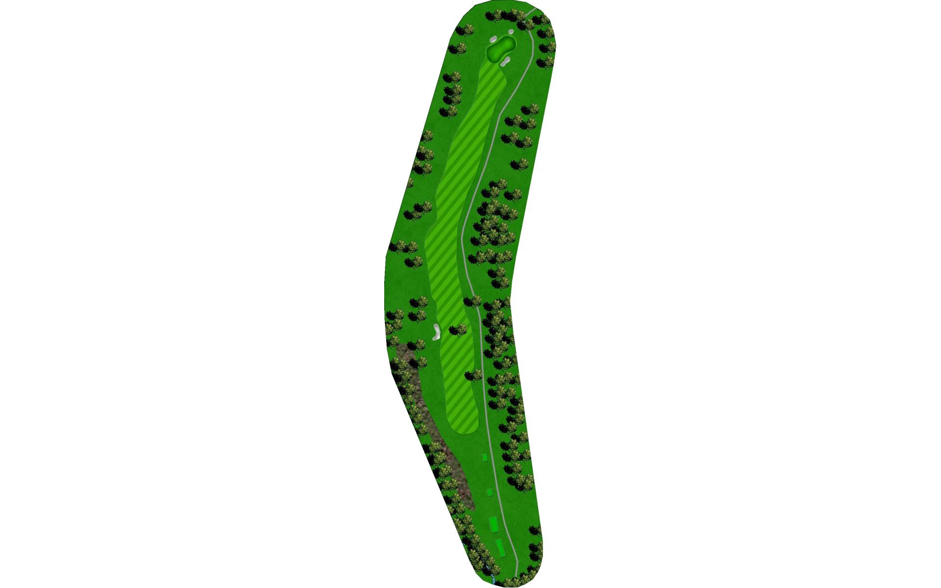 A dogleg left par 4 with OB up the left side from tee to green. The green has a ridge that cuts it in half, and slopes from left to right.