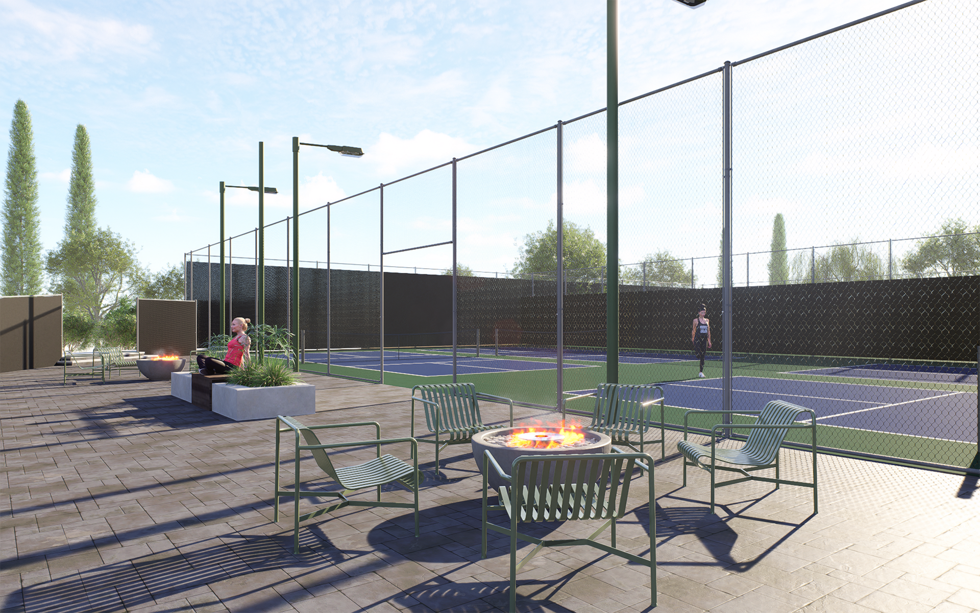 New dedicated, paved sitting area between pickleball courts, complete with new furniture and a portable bar. This is the perfect spot to watch a match, relax with other players, or enjoy a beverage.