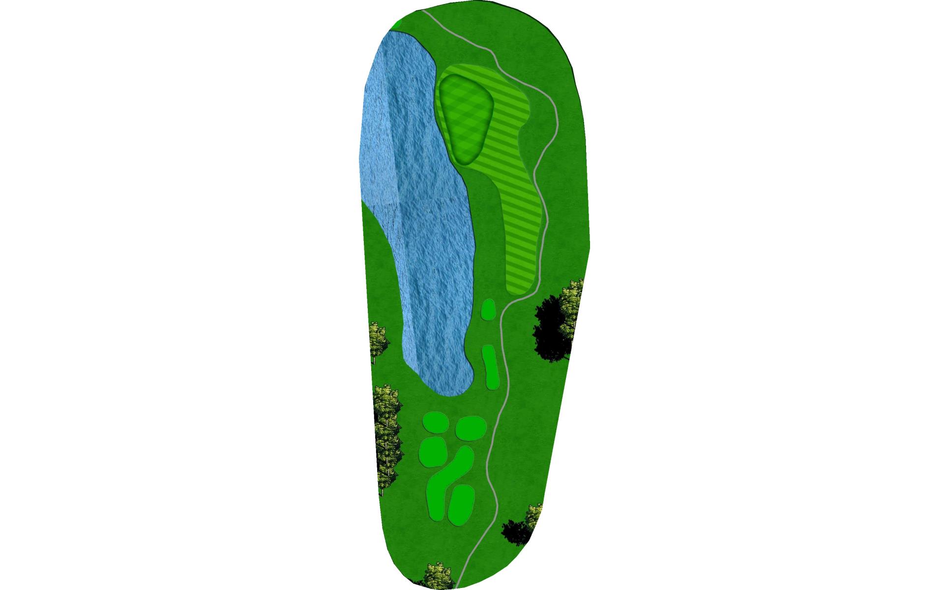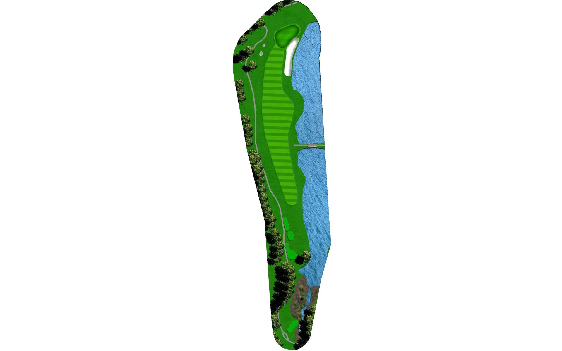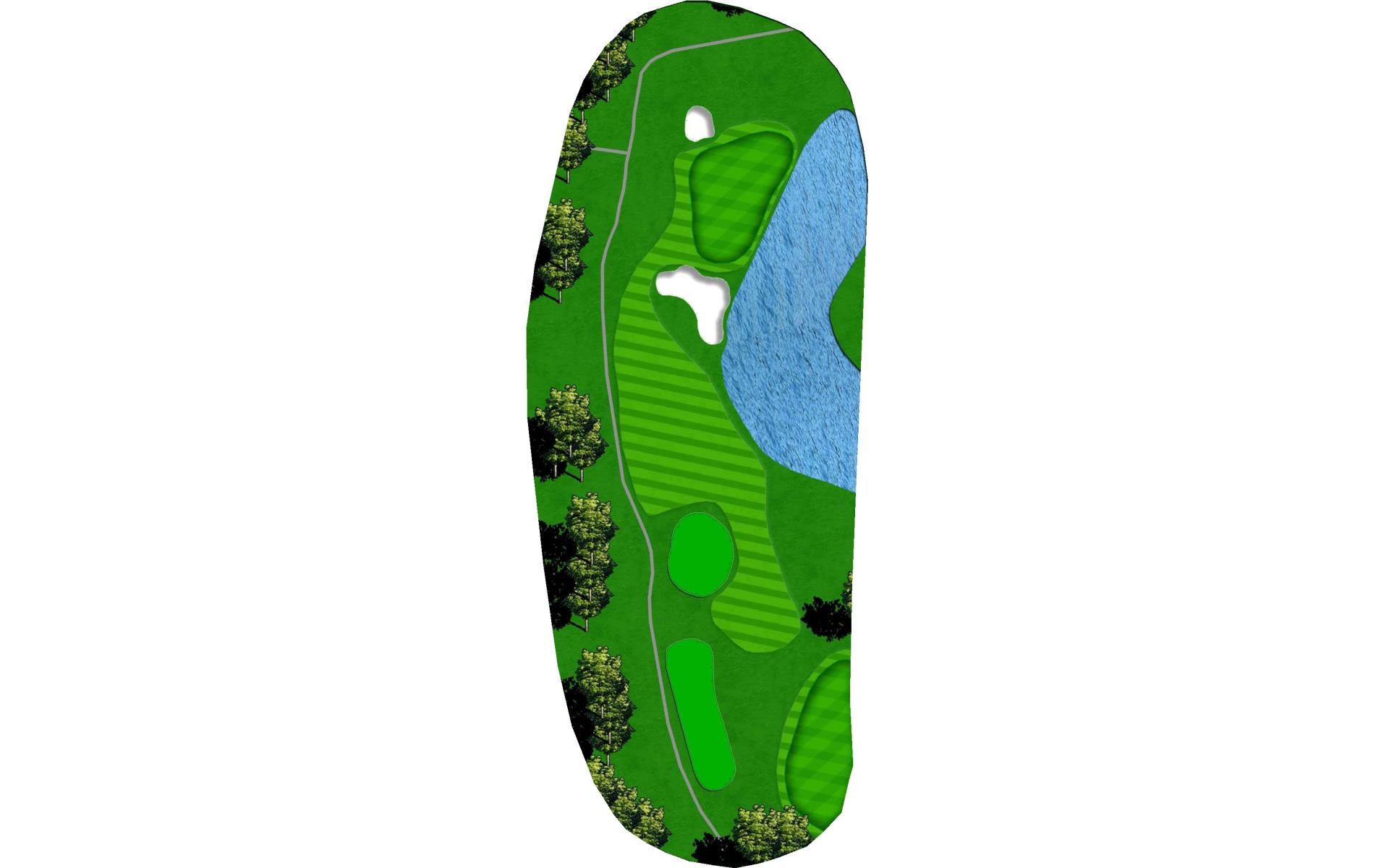 Final par 3 on the course. Green surrounded by water on the left and deep grass bunkers short and right of green. Accurate club selection is a must for a good look at birdie.
