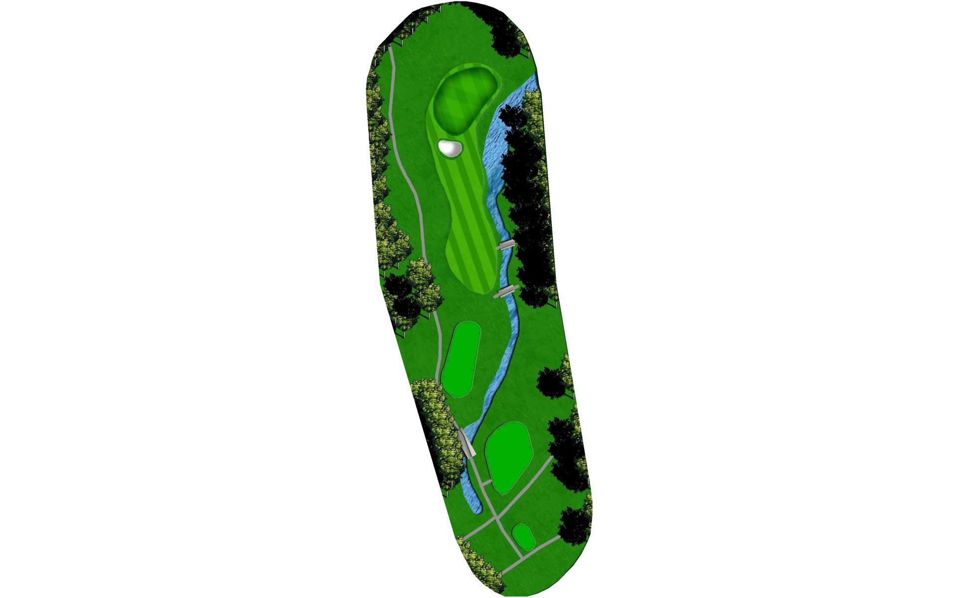 Solid par 4 finishing hole. Creek runs the length of the left side with fairway sloping towards hazard. Large mounds right help to catapult ball down the fairway. Avoid hitting it too far as second will be 50 ft below green surface. Well placed tee ball leaves 100yds and clear view of green. Precise second shot to proper tier required for good birdie chance.