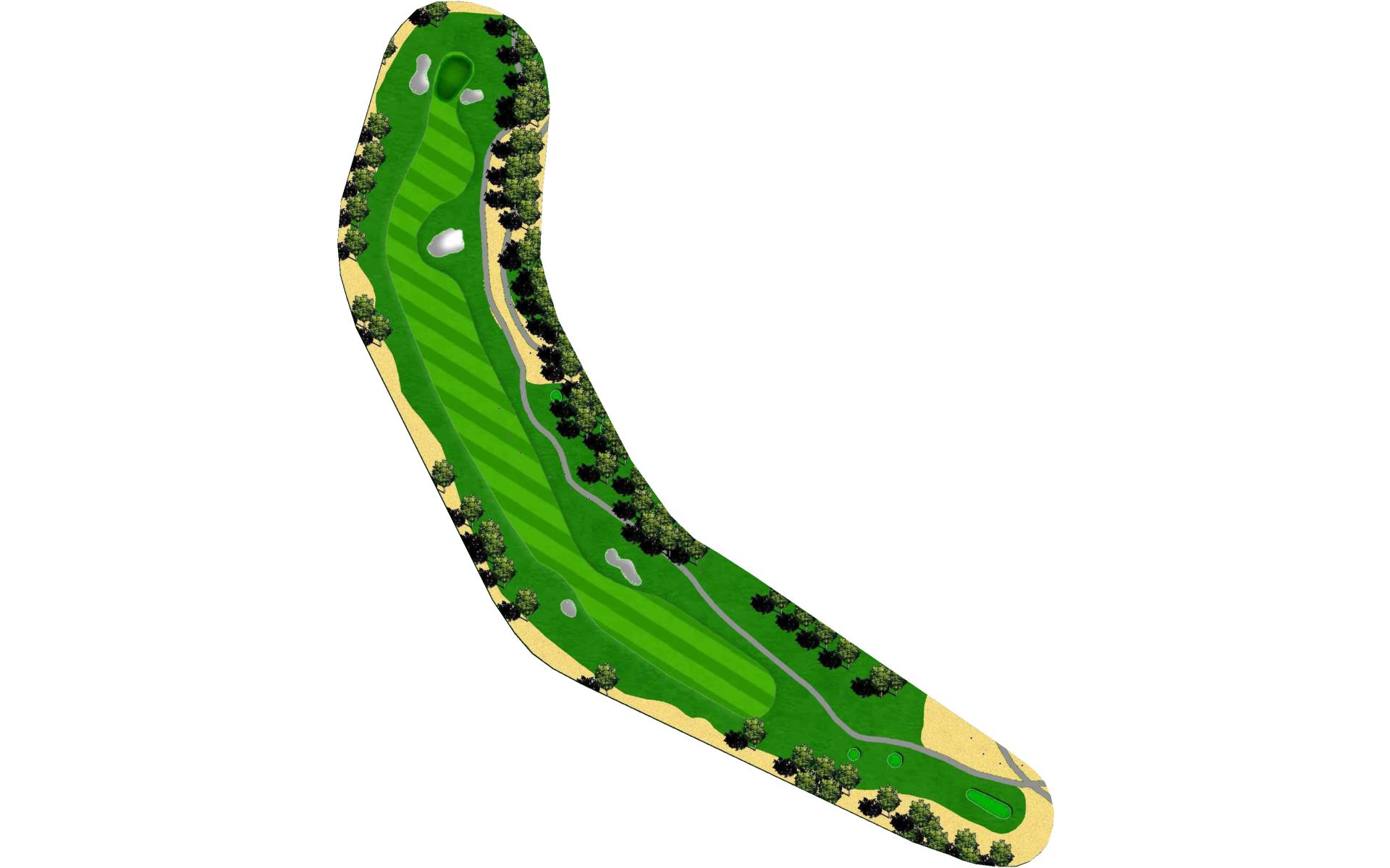 A dogleg left with a fairway bunker guarding the left corner. An accurate second shot will give an easier approach to the elevated two-level green. Aim left of the fairway to avoid the mounds on the right.
