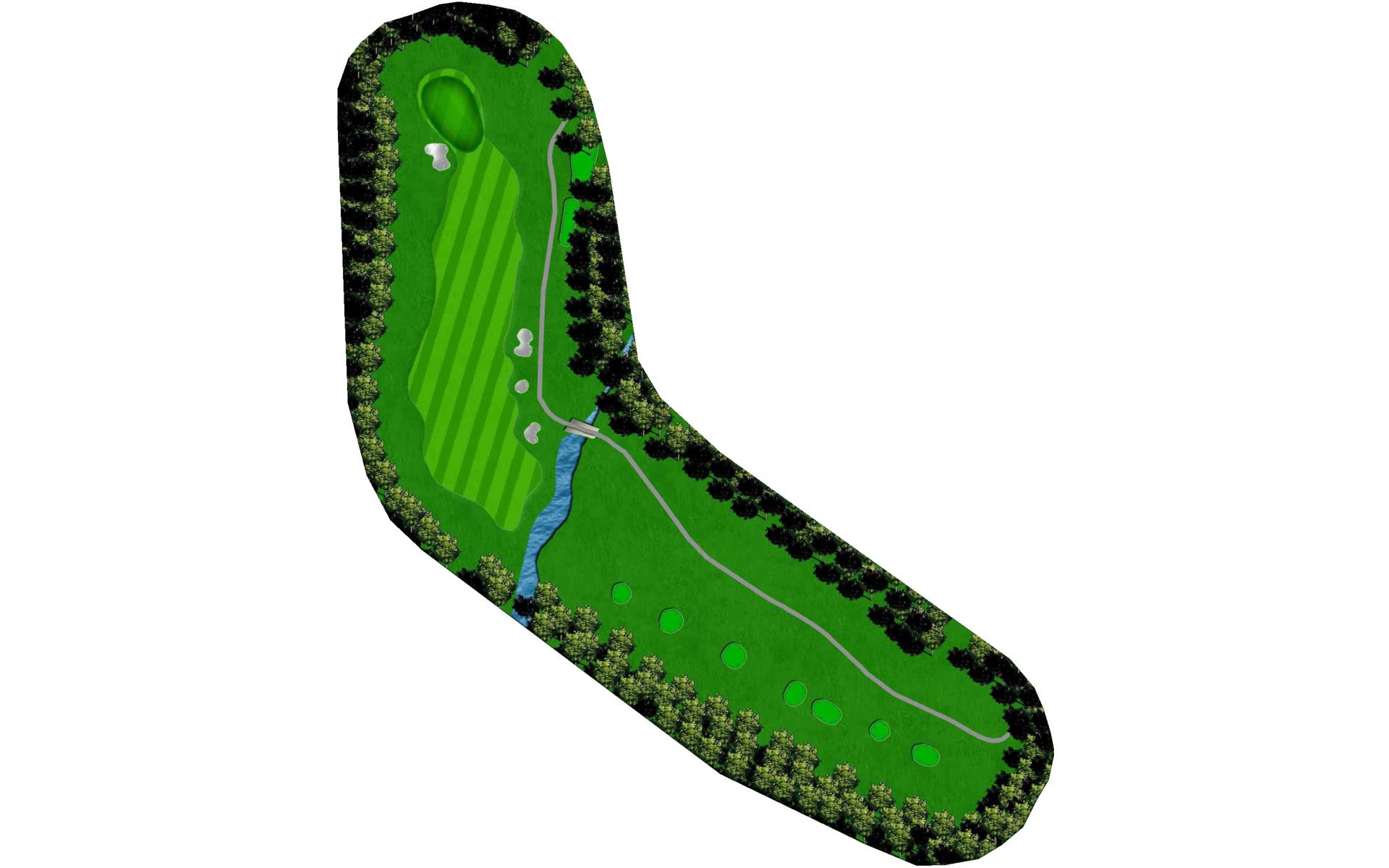 A scenic downhill dog leg right par 4 with a forced carry on your tee shot over a large creek. A very difficult second shot up hill to another well bunkered, spacious green.